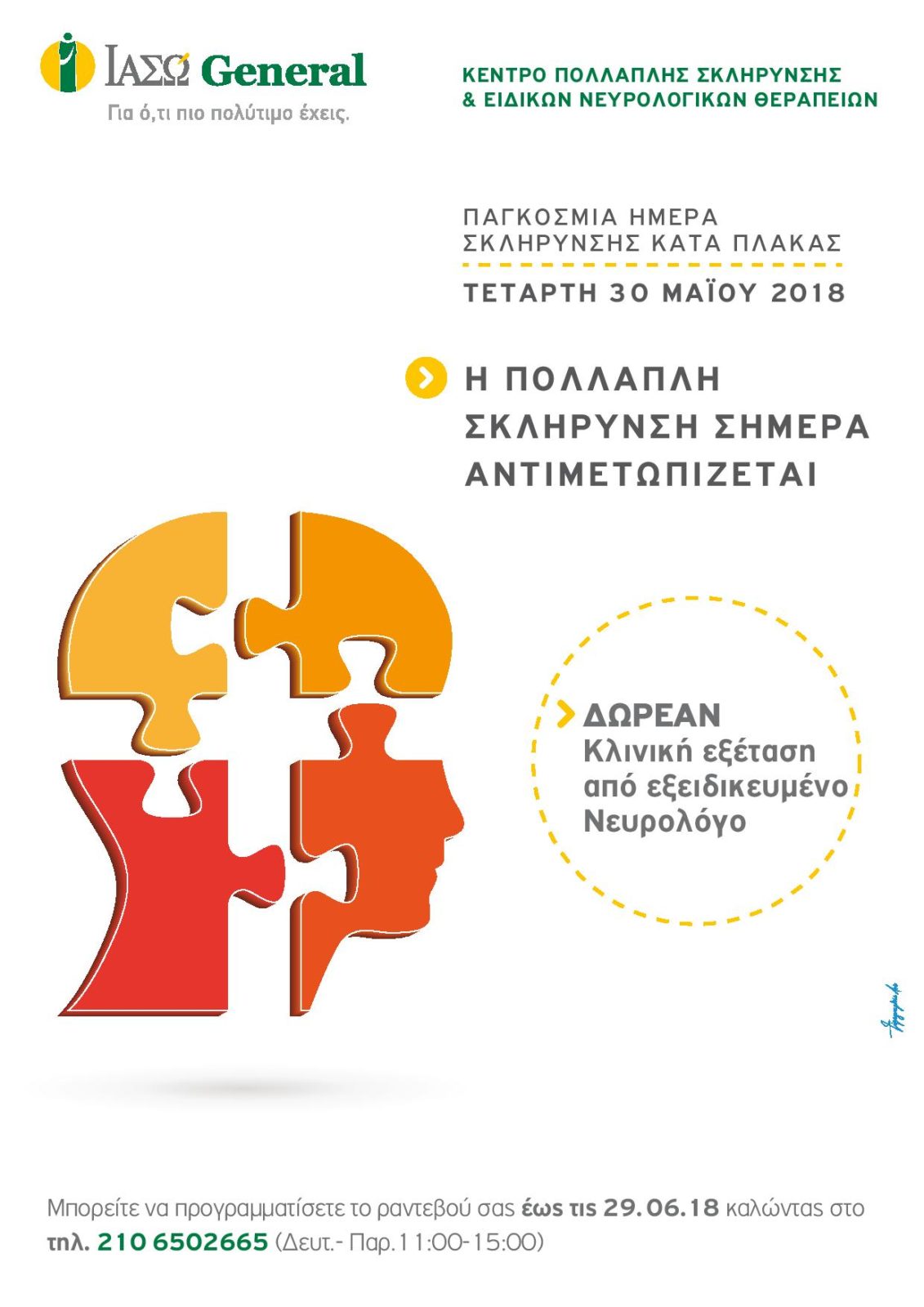 Mε το αισιόδοξο μήνυμα «Η πολλαπλή σκλήρυνση σήμερα αντιμετωπίζεται» το Κέντρο Πολλαπλής Σκλήρυνσης και Ειδικών Νευρολογικών Θεραπειών του ΙΑΣΩ General, με αφορμή την Παγκόσμια Ημέρα Σκλήρυνσης κατά Πλάκας, προσφέρει Δωρεάν κλινική εξέταση από εξειδικευμένο νευρολόγο.