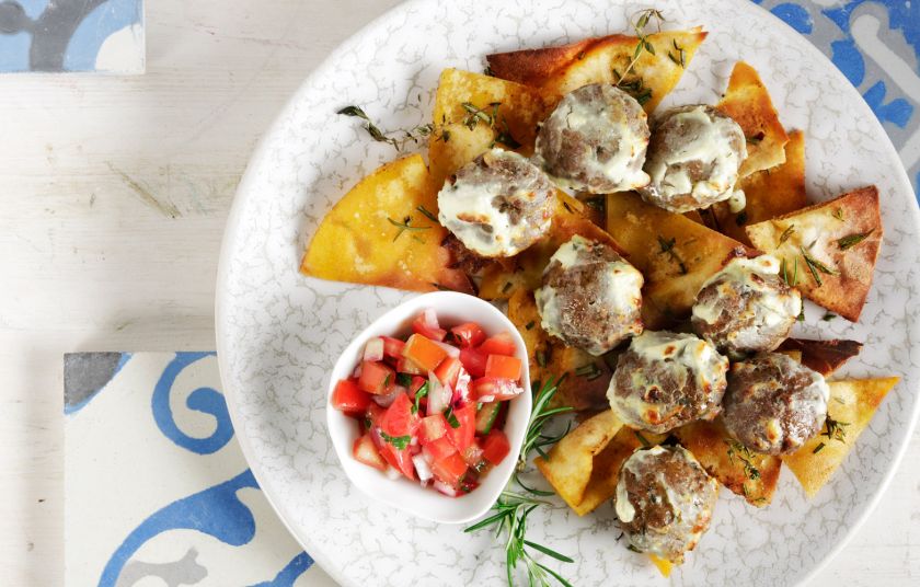 Κεφτέδες φούρνου σε μείγμα ξύγαλο-γιαούρτι με τραγανές πικάντικες πίτες