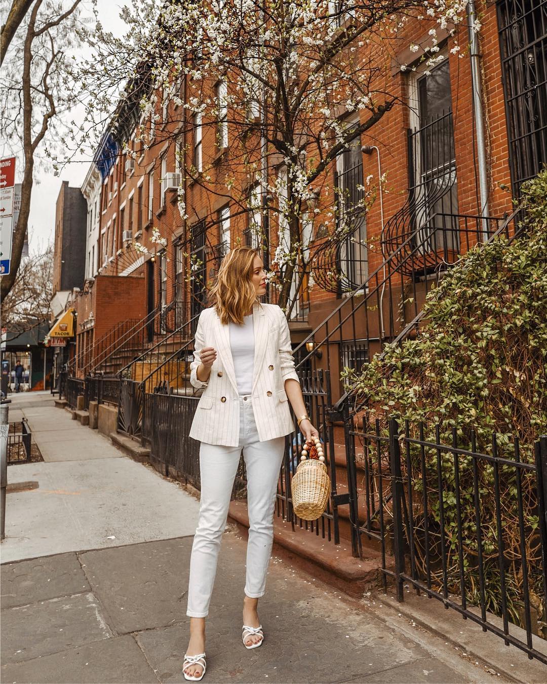 Συνδυάστε ένα ψηλόμεσο λευκό παντελόνι με ένα λευκό τοπ. Ολοκληρώστε το look σας με ένα ζευγάρι λευκά ψηλοτάκουνα πέδιλα. Αυτό το σύνολο είναι ιδανικό για το γραφείο, ειδικά αυτή την εποχή.