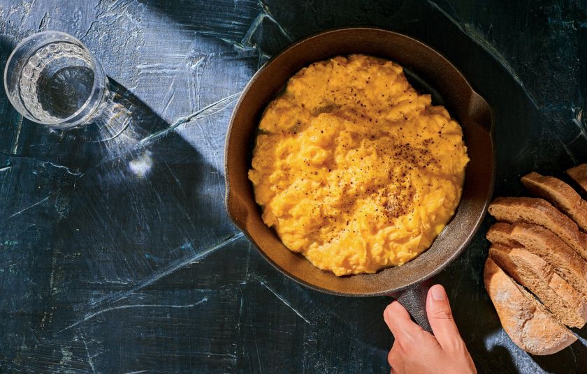 Σε ένα μεγάλο αντικολλητικό τηγάνι ζεσταίνουμε το βούτυρο σε δυνατή φωτιά μέχρι να λιώσει. Ρίχνουμε το μείγμα αυγών και χαμηλώνουμε αρκετά τη φωτιά. Δεν ανακατεύουμε. Περιμένουμε 1 λεπτό, μέχρι η βάση των αυγών να αρχίσει να πήζει. Με μια σπάτουλα διπλώνουμε τα αυγά από έξω προς τα μέσα, κομματιάζοντάς τα. Γέρνουμε το τηγάνι, για να τρέχει στις άκρες το αυγό που δεν έχει έρθει άμεσα σε επαφή με την επιφάνεια του σκεύους και δεν έχει δέσει. Επαναλαμβάνουμε μέχρι να ψηθούν τα αυγά, αλλά να μη στεγνώσουν. Τραβάμε το τηγάνι από τη φωτιά και προσθέτουμε τους δύο κρόκους. Ανακατεύουμε με τη σπάτουλα, να πάνε παντού οι κρόκοι και σχεδόν να δέσουν. Βάζουμε τα αυγά σκραμπλ στο πιάτο, όπου θα συνεχίσουν να ψήνονται για 1-2 λεπτά, και σερβίρουμε.