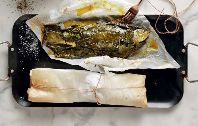 Απλώνουμε ένα κομμάτι λαδόκολλα σε πάγκο εργασίας, ραντίζουμε με λίγο λάδι και λεμόνι και στρώνουμε 5-6 αμπελόφυλλα με τρόπο που να μισοκαλύπτει το ένα το άλλο. Τα ραντίζουμε με λίγο λάδι ακόμa και βάζουμε το ένα λαβράκι κατά μήκος των φύλλων. Αλείφουμε το ψάρι με το 1/4 του μείγματος του μπολ και το τυλίγουμε στα αμπελόφυλλα. Τυλίγουμε με τη λαδόκολλα και επαναλαμβάνουμε τη διαδικασία με τα υπόλοιπα ψάρια.