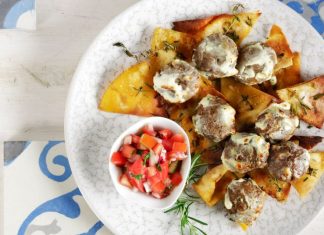 Κεφτέδες φούρνου σε μείγμα ξύγαλο-γιαούρτι με τραγανές πικάντικες πίτες