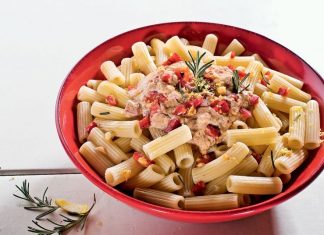 Ριγκατόνι με σάλτσα ταραμά, πιπεριές Φλωρίνης και αμύγδαλα