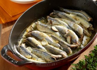 Γαύρος φουρνιστός με ζεστή πατατοσαλάτα